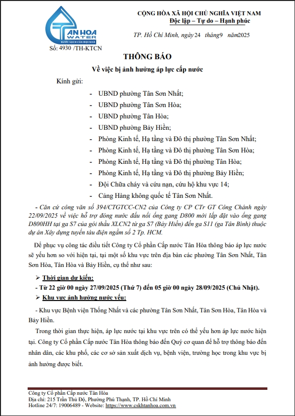 Căn cứ Thông báo số 4930/TH-KTCN ngày 24/09/2025 về việc ảnh hưởng áp lực cấp nước để phục vụ công tác “Đấu nối ống gang D800”. Trong thời gian thi công, sửa chữa áp lực nước sẽ yếu so với hiện tại.