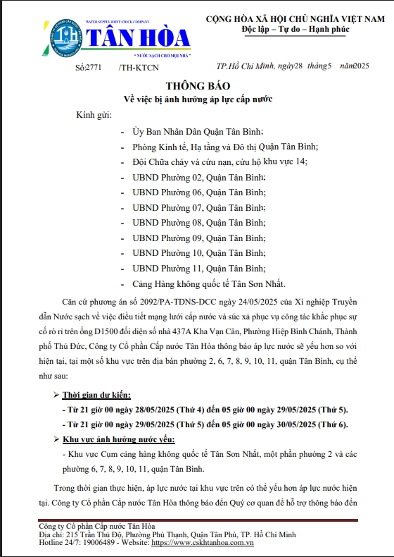 Căn cứ Thông báo số 2771/TH-KTCN ngày 28/05/2025 về việc ảnh hưởng áp lực cấp nước để phục vụ công tác “Điều tiết, súc xả mạng lưới cấp nước phục vụ công tác khắc phục sự cố rò rỉ ống D1500”. Trong thời gian thi công, sửa chữa áp lực nước sẽ yếu hơn so với hiện tại.