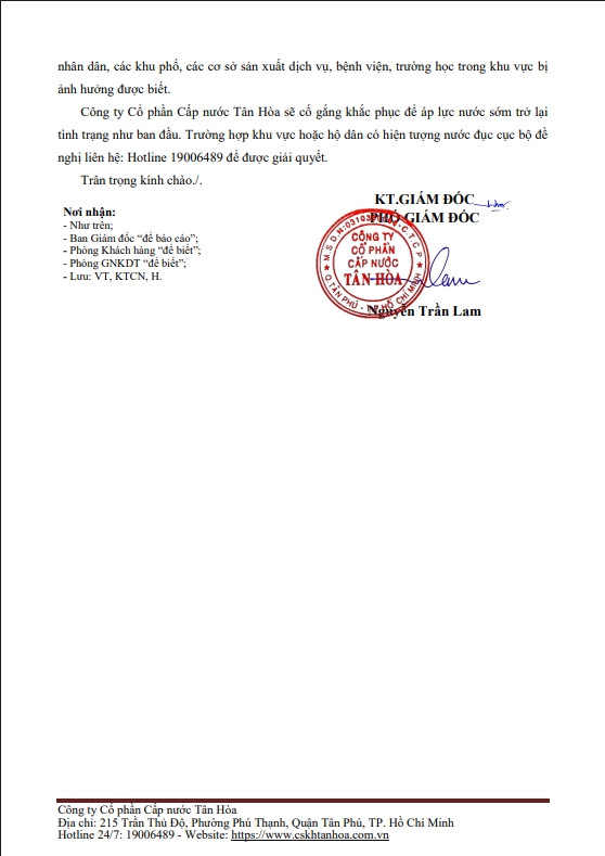 CÔNG TY CỔ PHẦN CẤP NƯỚC TÂN HÒA