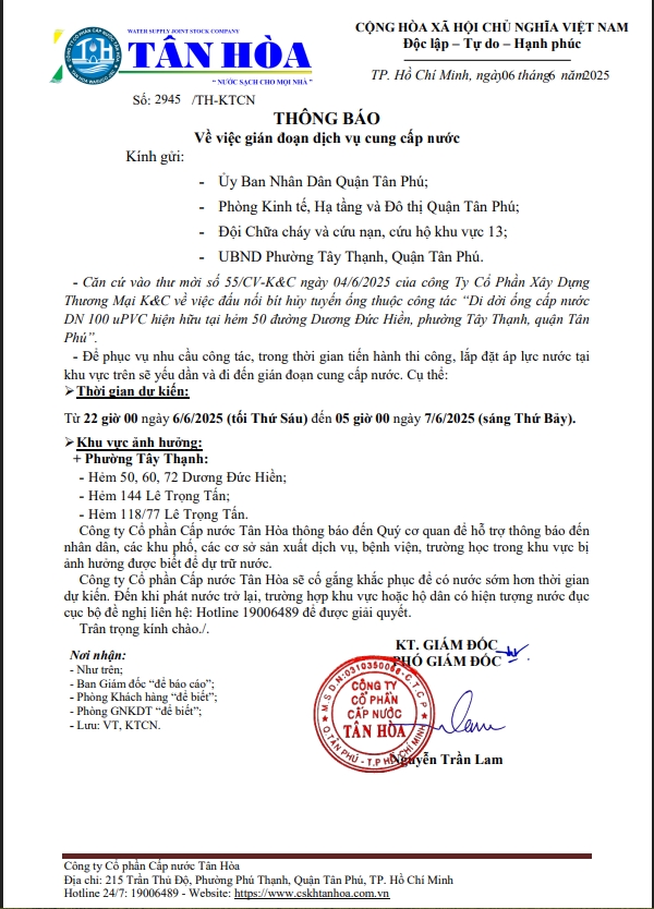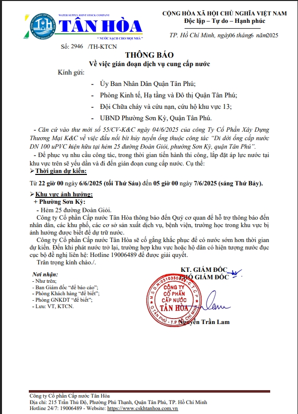 Căn cứ Thông báo số 2945,2946/TH-KTCN ngày 06/06/2025 về việc gián đoạn dịch vụ cấp nước để phục vụ công tác “Di dời tuyến ống cấp nước trên địa bàn Công ty quản lý”. Trong thời gian thi công, sửa chữa áp lực nước sẽ yếu dần và đi đến cúp nước.