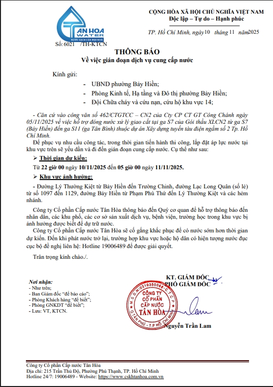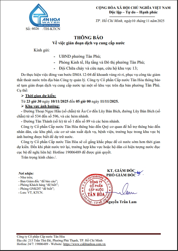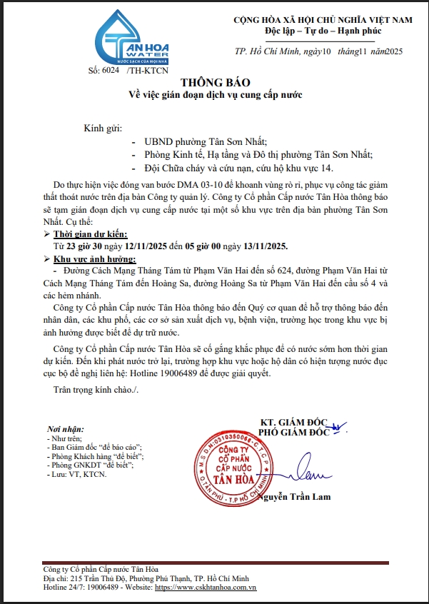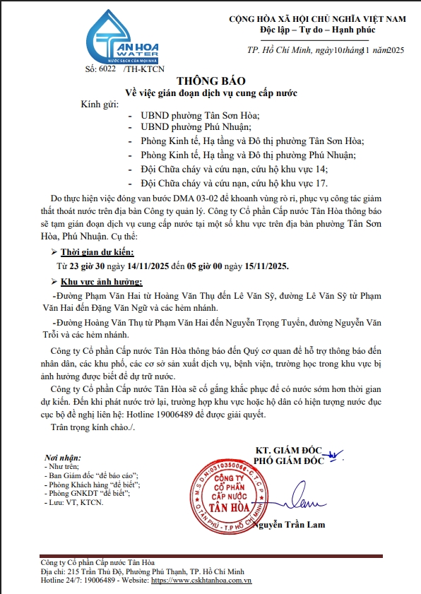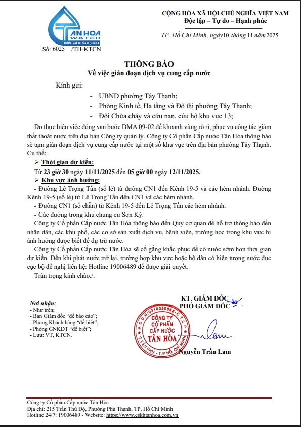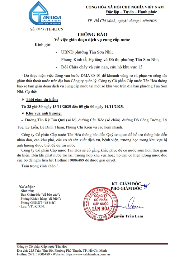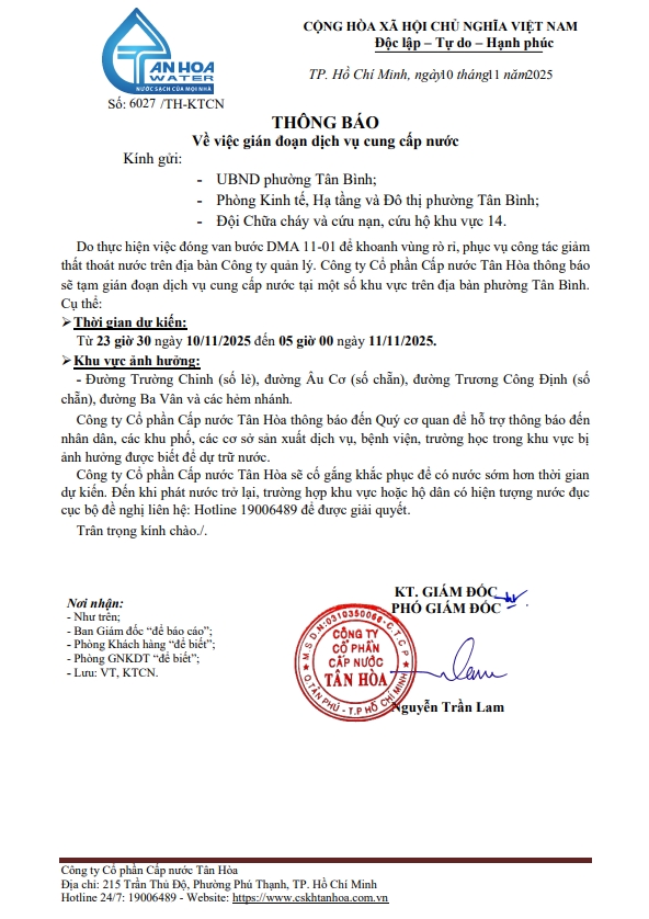 Căn cứ Thông báo số 6021->6027/TH-KTCN ngày 10/11/25 về việc gián đoạn DV cấp nước để phục vụ công tác“Khoanh vùng rò rỉ”. Trong thời gian thi công, sửa chữa áp lực nước sẽ yếu dần và đi đến cúp nước.