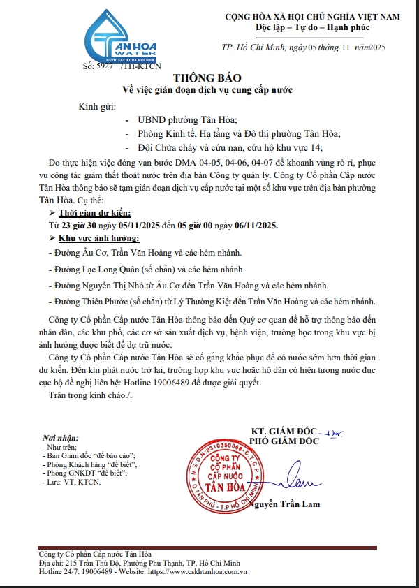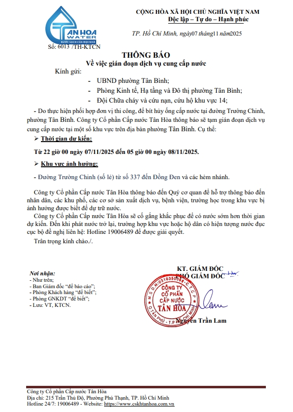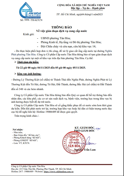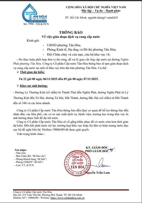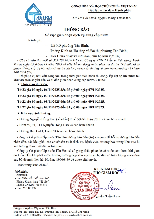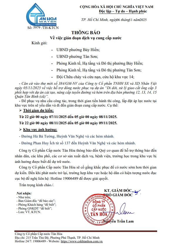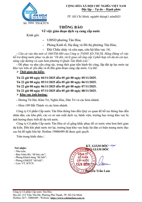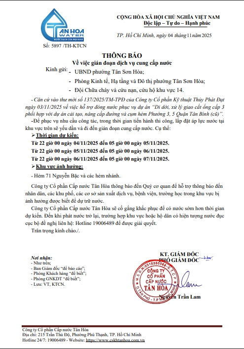 Căn cứ Thông báo số 5848->5855,79,94,95,96,97,5927,66,67,79,6013/TH-KTCN ngày 03,4,5,6,7/11/25 về việc gián đoạn DV cấp nước để phục vụ công tác“ Di dời, XLGC, đấu nối tuyến ống; khoanh vùng”. Trong thời gian thi công, sửa chữa áp lực nước sẽ yếu dần và đi đến cúp nước.