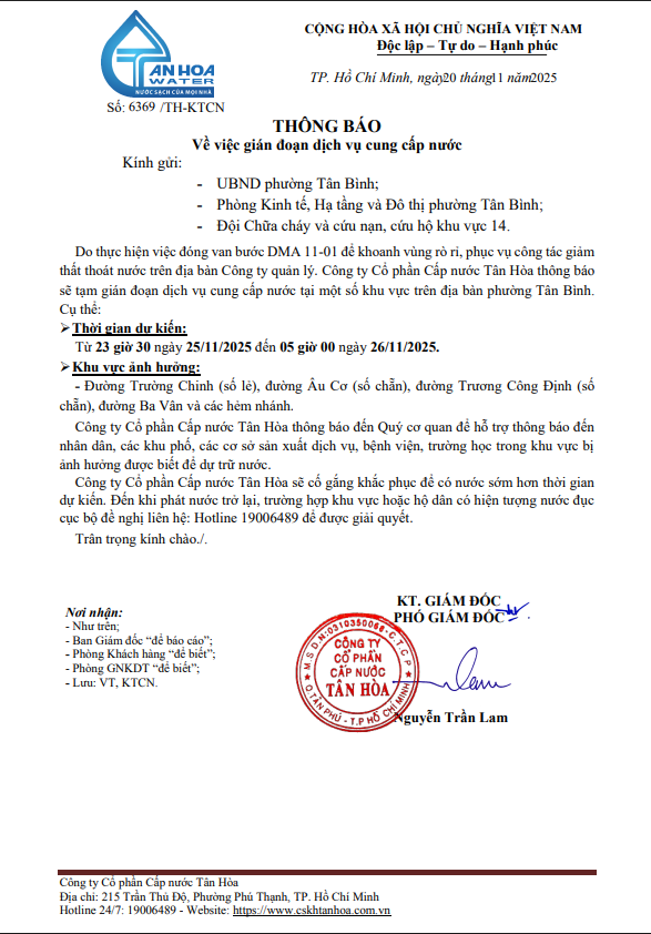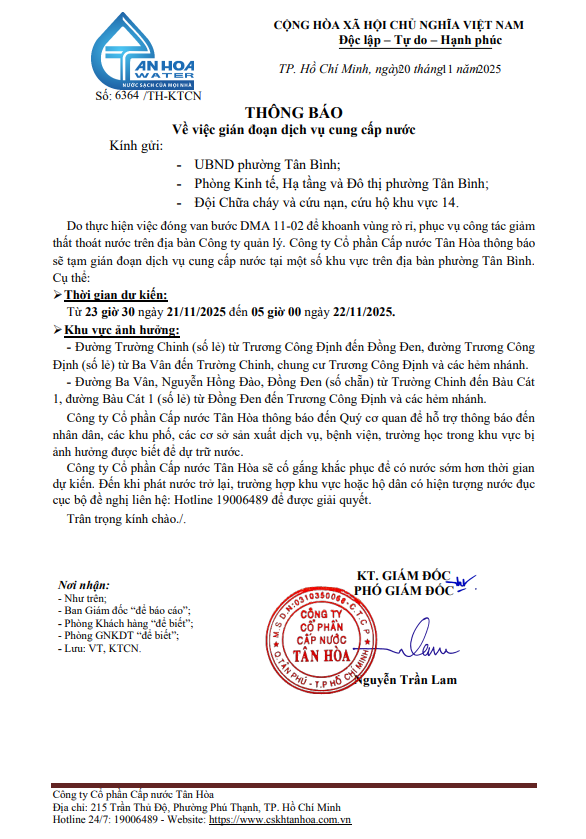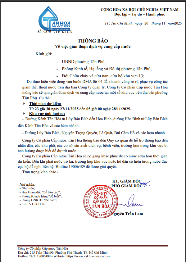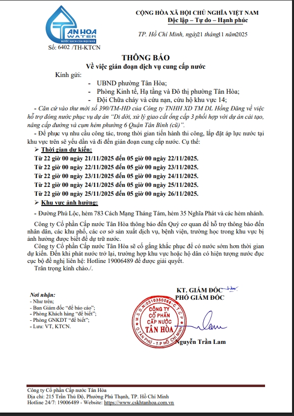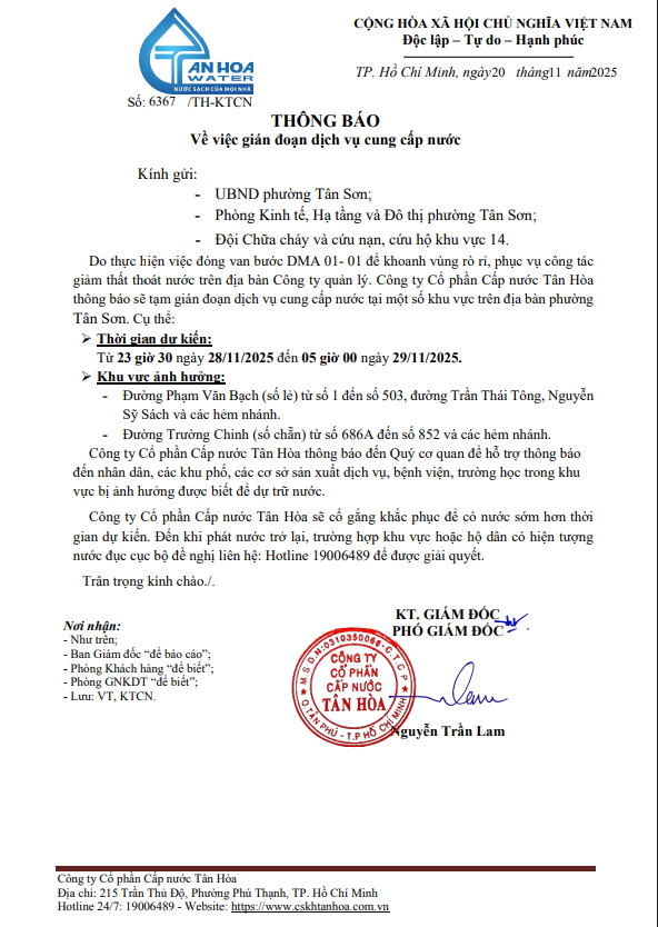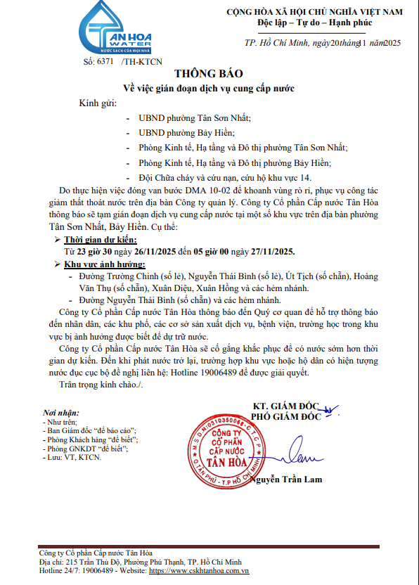 Căn cứ Thông báo số 6331,64,67,68,39,70,71,6402/TH-KTCN ngày 20,21/11/2025 về việc gián đoạn DV cấp nước để phục vụ công tác“Di dời, xử lý giao cắt trên địa bàn Công ty quản lý”. Trong thời gian thi công, sửa chữa áp lực nước sẽ yếu dần và đi đến cúp nước.
