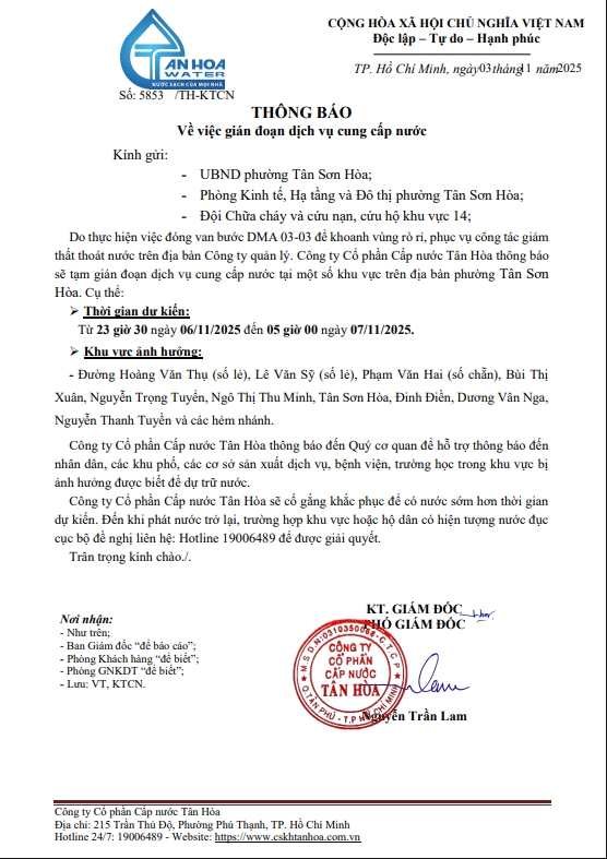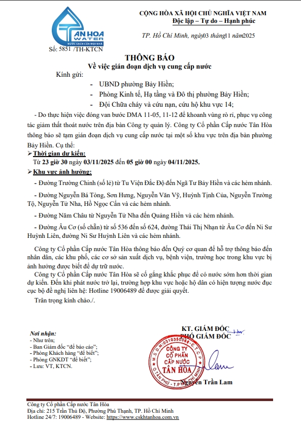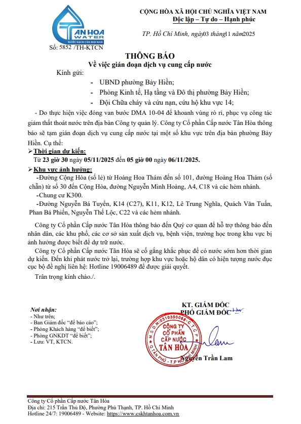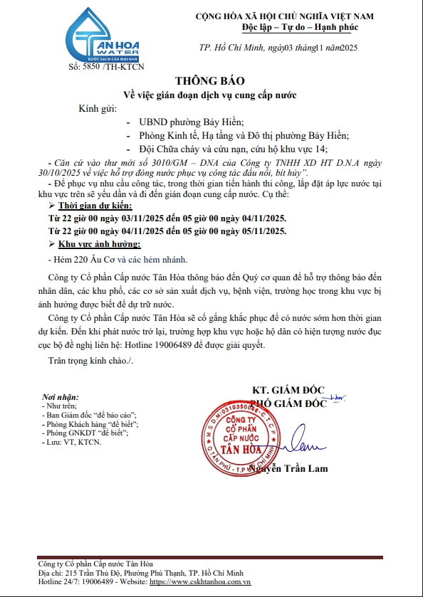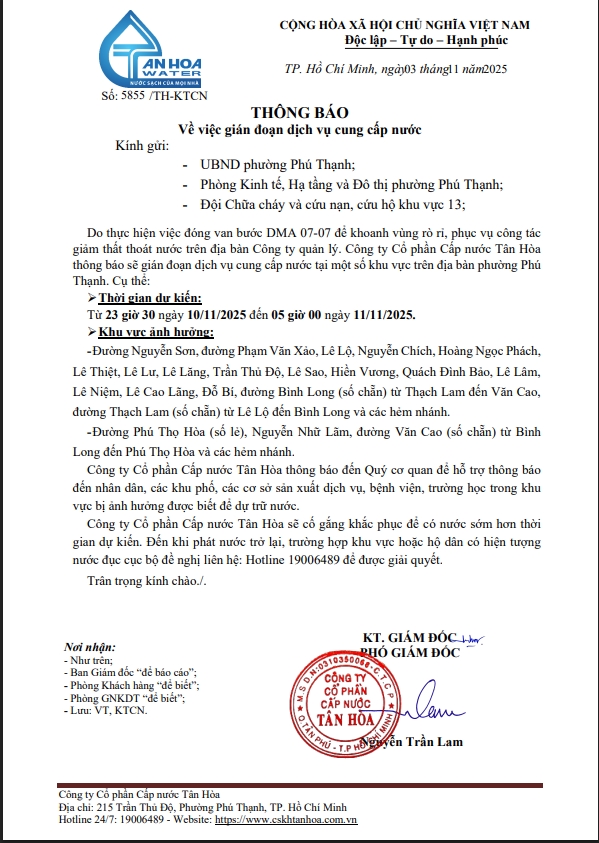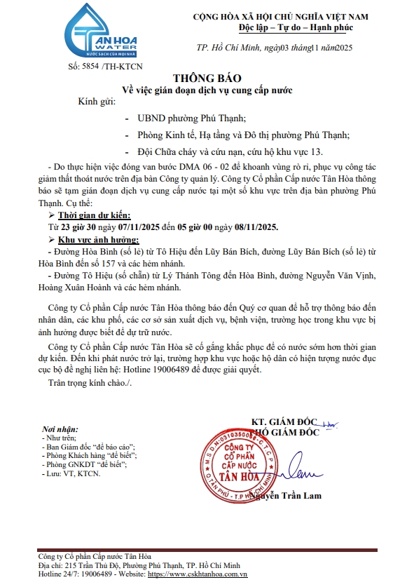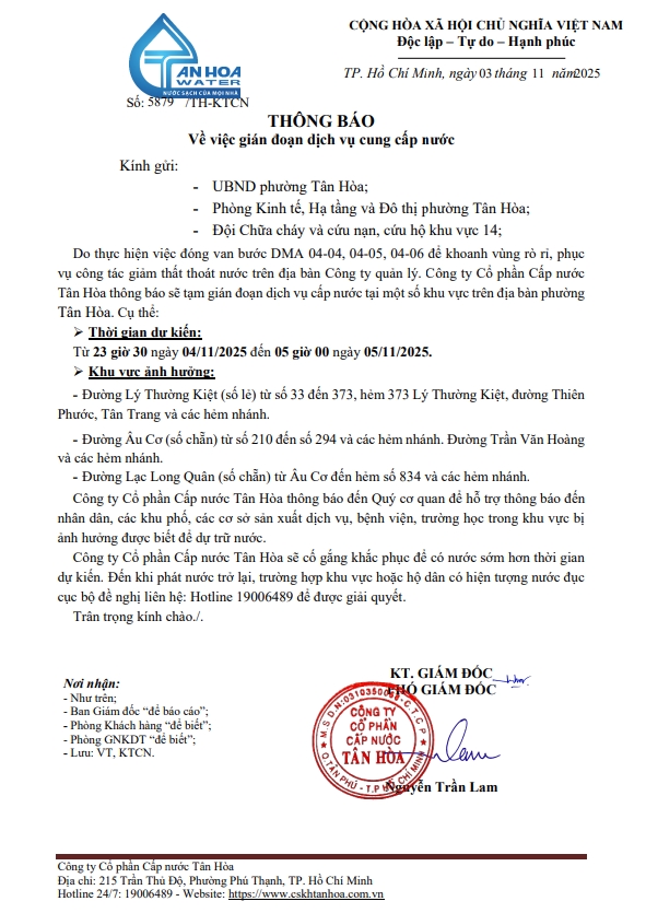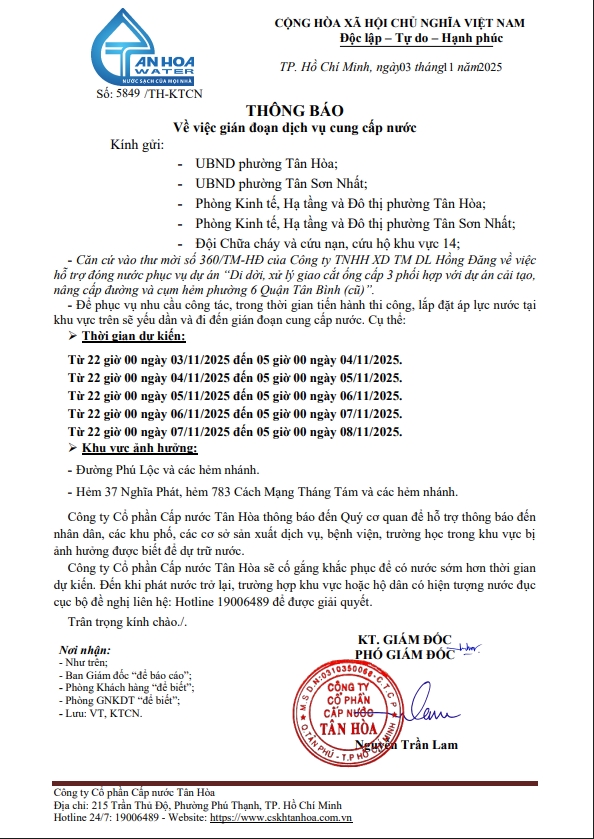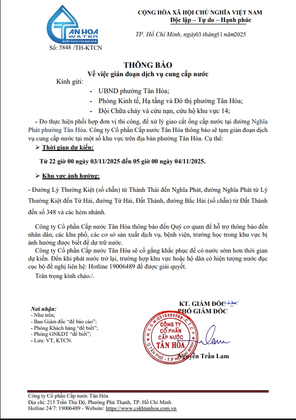 Căn cứ Thông báo số 5848->5855,79/TH-KTCN ngày 03/11/25 về việc gián đoạn DV cấp nước để phục vụ công tác“ Di dời, XLGC, đấu nối tuyến ống; khoanh vùng”. Trong thời gian thi công, sửa chữa áp lực nước sẽ yếu dần và đi đến cúp nước.