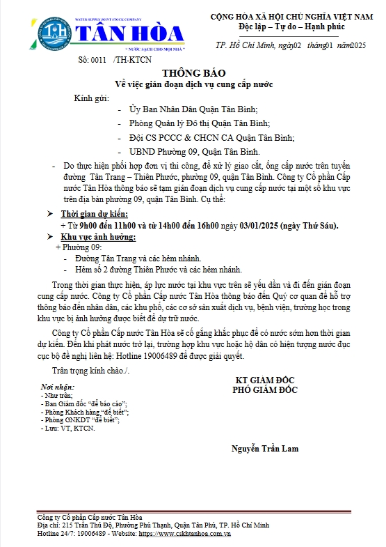 Căn cứ Thông báo số 0011/TH-KTCN ngày 02/01/2025 về việc gián đoạn dịch vụ cấp nước để phục vụ công tác “Xử lý giao cắt, phối hợp làm đường trên địa bàn Công ty quản lý”. Trong thời gian thi công, sửa chữa áp lực nước sẽ yếu dần và đi đến ngưng nước.