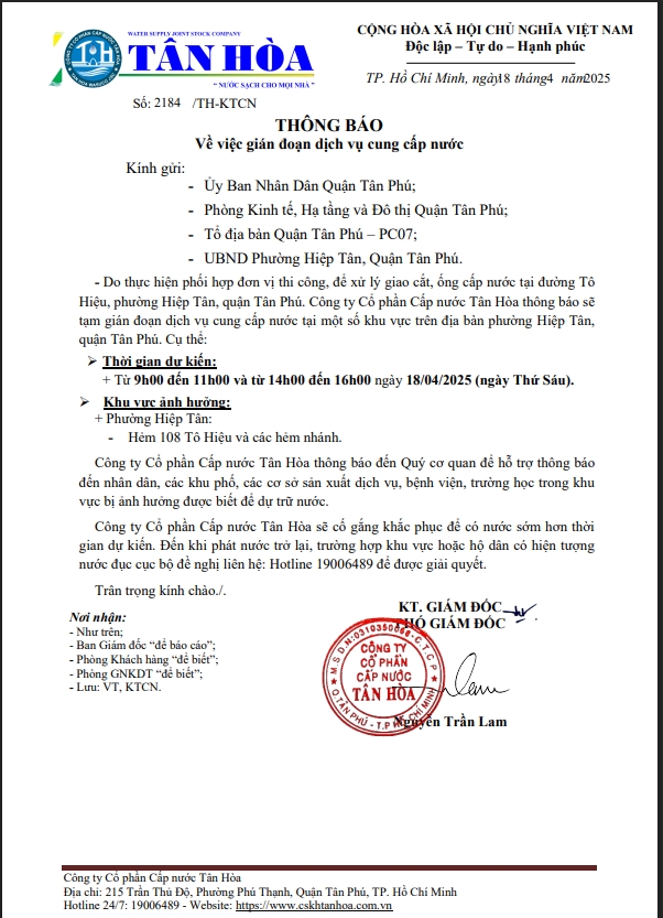 Căn cứ Thông báo số 2184/TH-KTCN ngày 18/04/2025 về việc gián đoạn dịch vụ cấp nước để phục vụ công công “Xử lý giao cắt tuyến ống trên địa bàn Công ty quản lý”. Trong thời gian thi công, sửa chữa áp lực nước sẽ yếu dần và đi đến cúp nước.