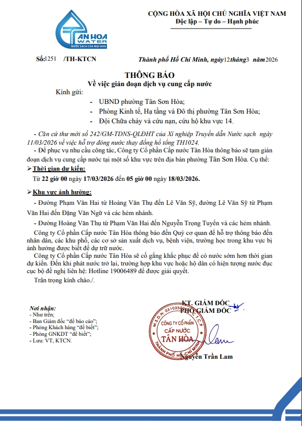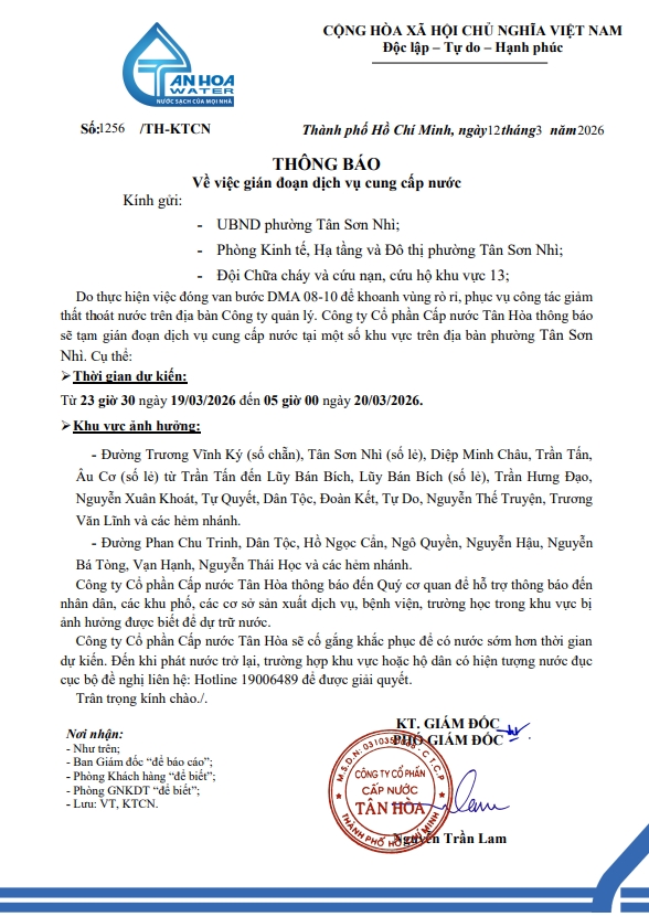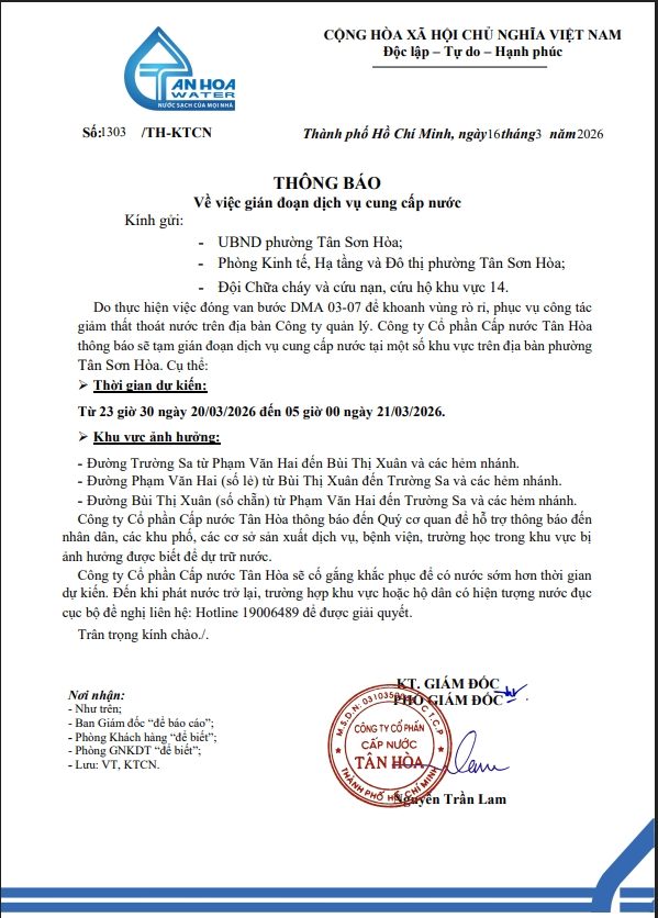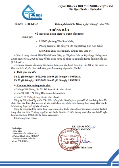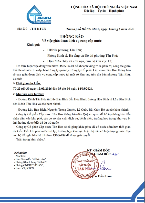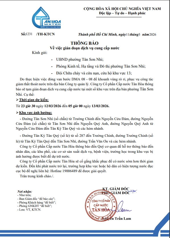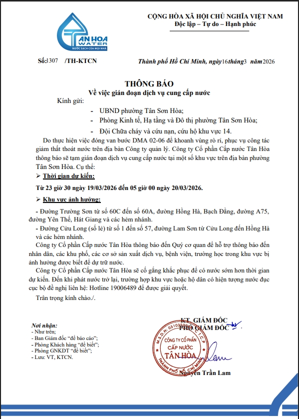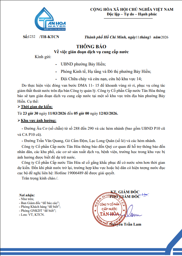 Căn cứ Thông báo số 1230,1231,1232,1251,1256,1298,1302,1303,1307/TH-KTCN ngày 11->16/03/2026 về việc gián đoạn DV cấp nước để phục vụ công tác“Khoanh vùng rò rỉ, đóng nước ĐHN tổng trên địa bàn Công ty quản lý”. Trong thời gian thi công, sửa chữa áp lực nước sẽ yếu dần và đi đến cúp nước..