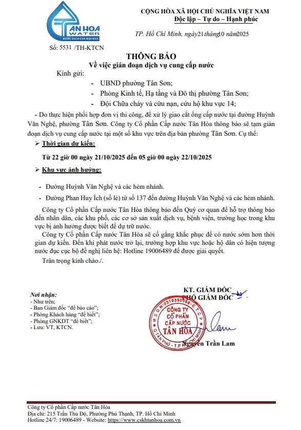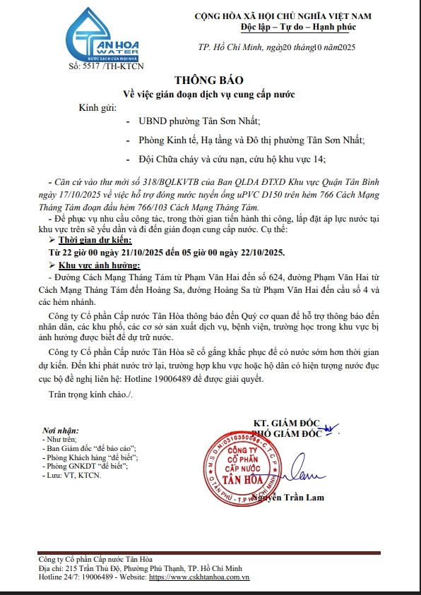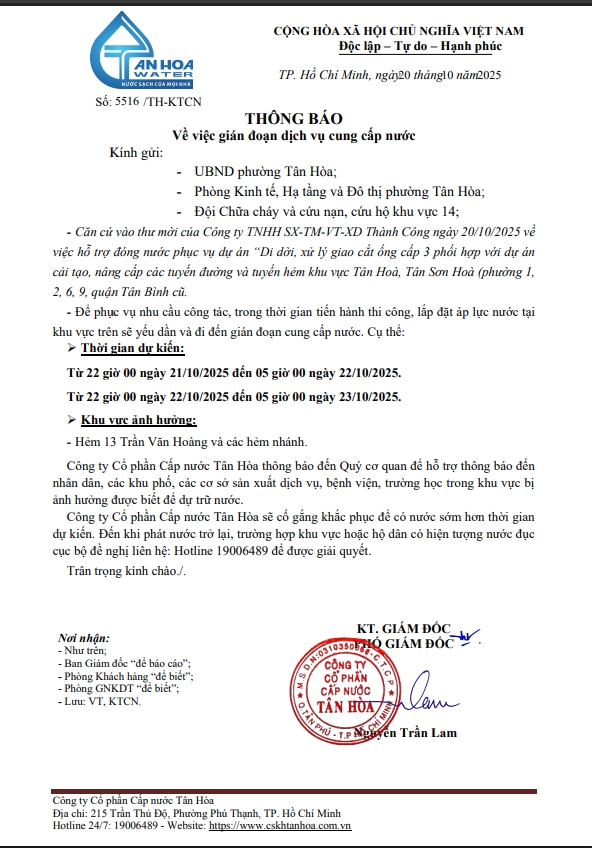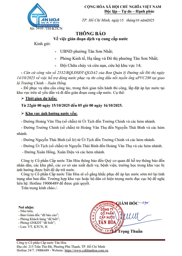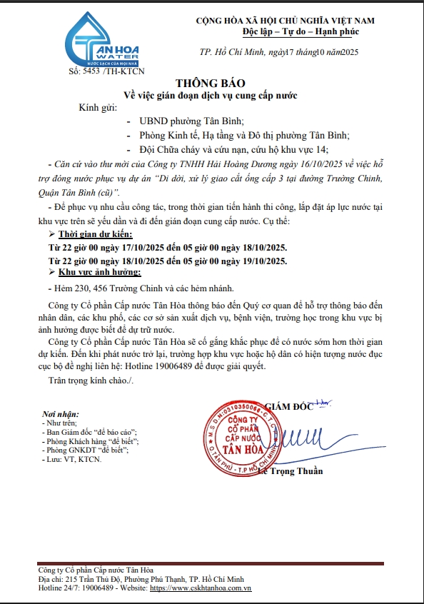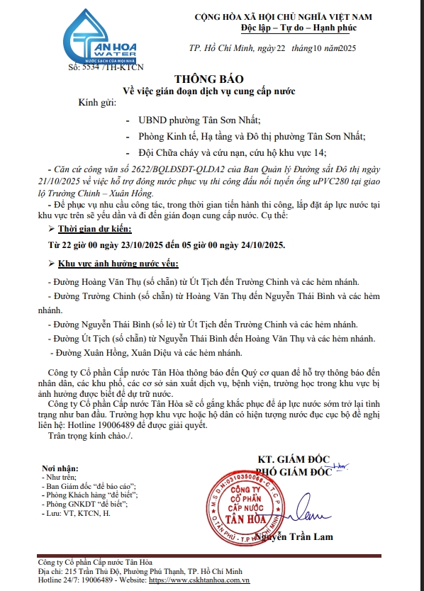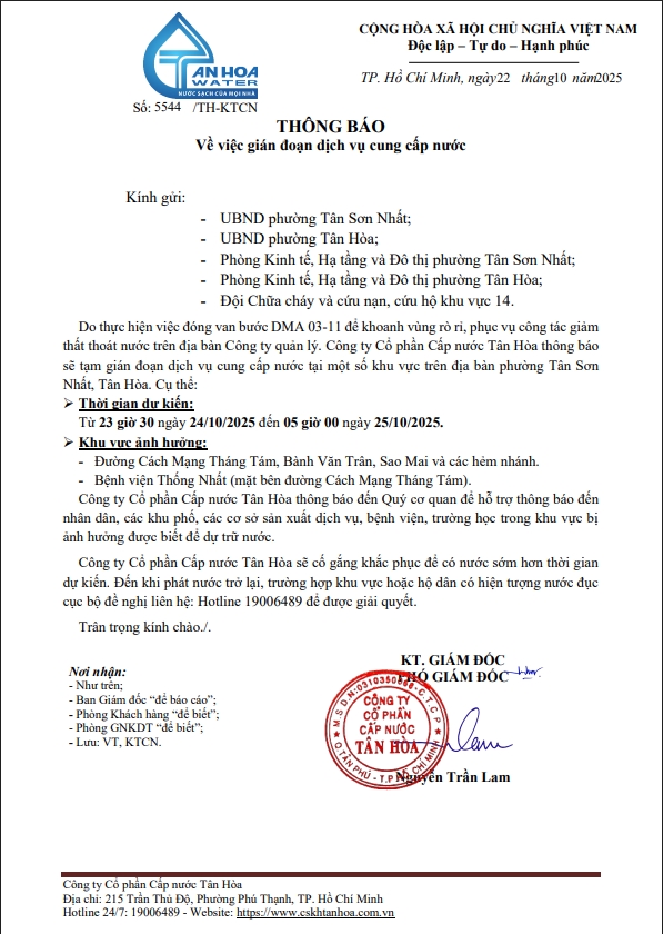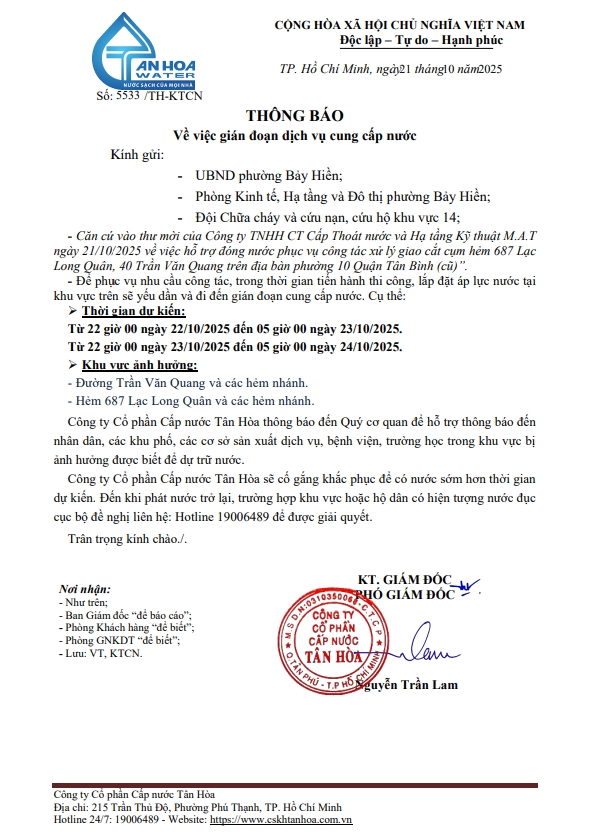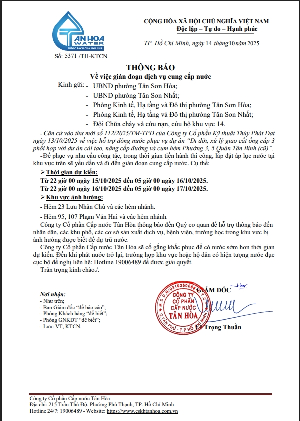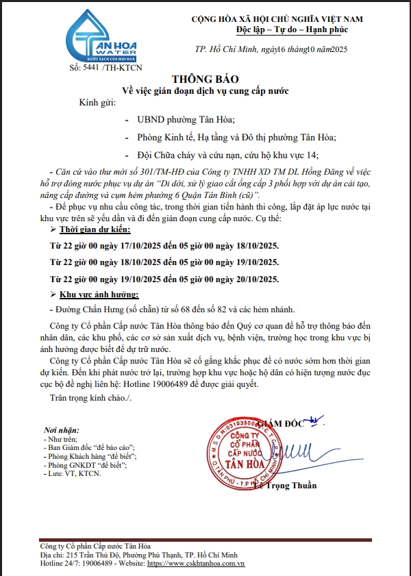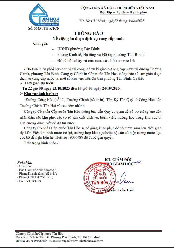 Căn cứ Thông báo số 5371,5410,5441,5453,16,17,5531,33,34,44,45,/TH-KTCN ngày 14,15,16,17,20,21,22/10/25 về việc gián đoạn DV cấp nước để phục vụ công tác“ Di dời, XLGC, đấu nối tuyến ống; khoanh vùng”. Trong thời gian thi công, sửa chữa áp lực nước sẽ yếu dần và đi đến cúp nước.