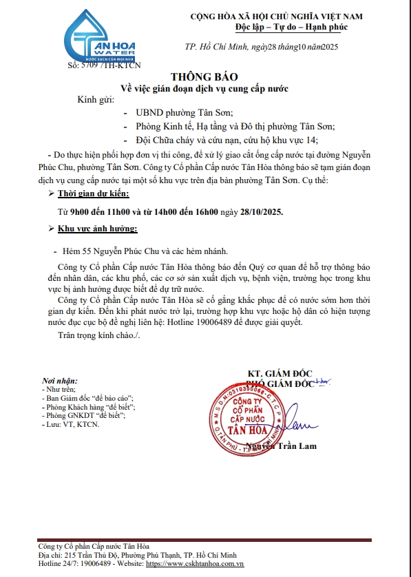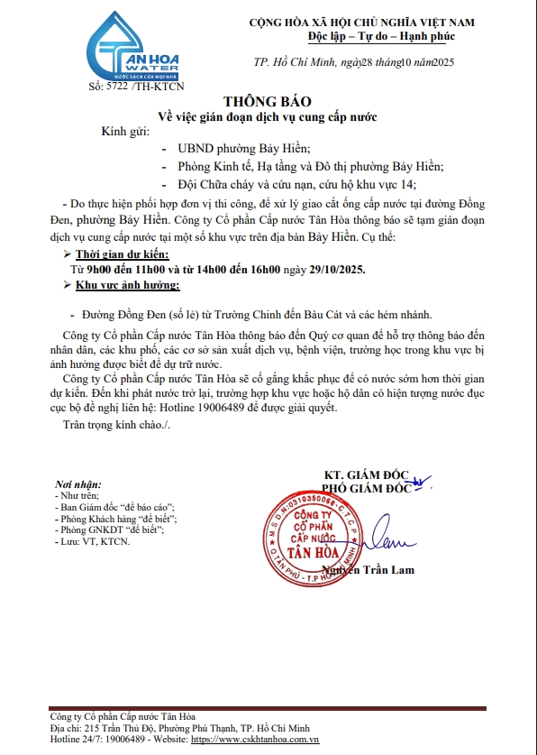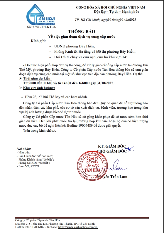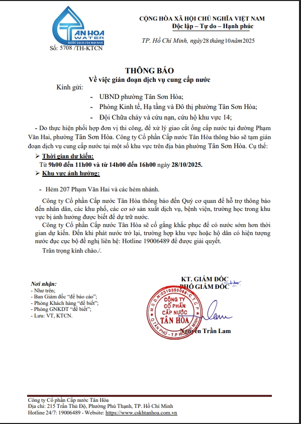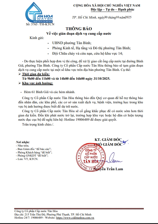 Căn cứ Thông báo số 5708,5709,22,65,66/TH-KTCN ngày 28,30/10/2025 về việc gián đoạn DV cấp nước để phục vụ công tác“Xử lý giao cắt trên địa bàn Công ty quản lý”. Trong thời gian thi công, sửa chữa áp lực nước sẽ yếu dần và đi đến cúp nước.