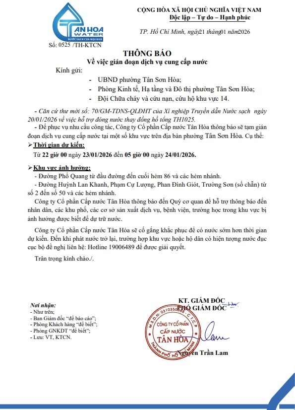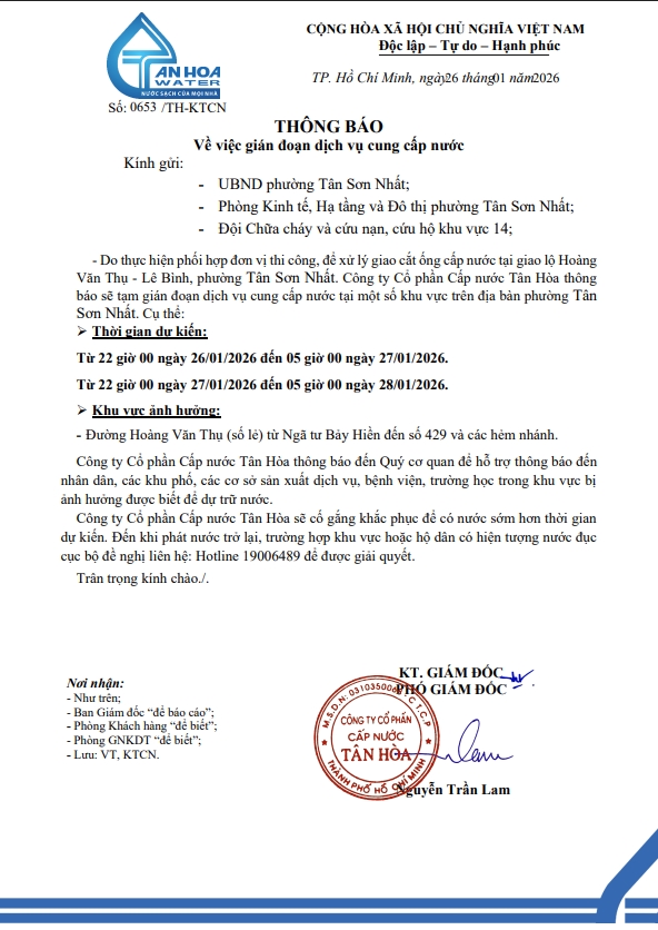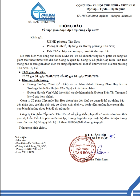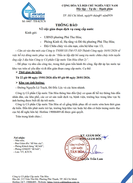 Căn cứ Thông báo số 0407,0525,0629,0653,0657,0658,0661/TH-KTCN ngày 16,21,23,26/01/2026 về việc gián đoạn DV cấp nước để phục vụ công tác“Khoanh vùng, xử lý GC;Đầu tư lắp đặt trụ cứu hỏa , thay ĐHT, hỗ trợ đóng nước ”. Trong thời gian thi công, sửa chữa áp lực nước sẽ yếu dần và đi đến cúp nước.