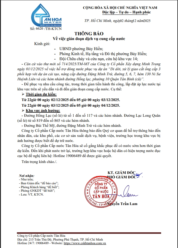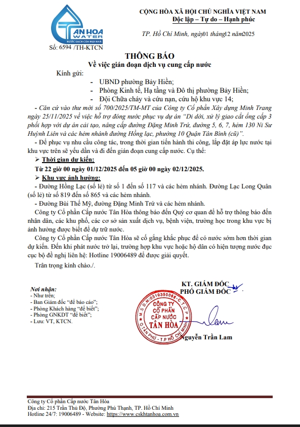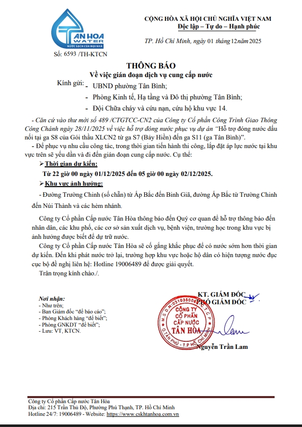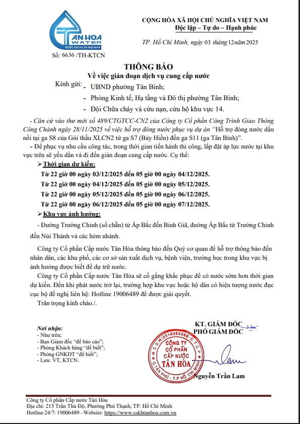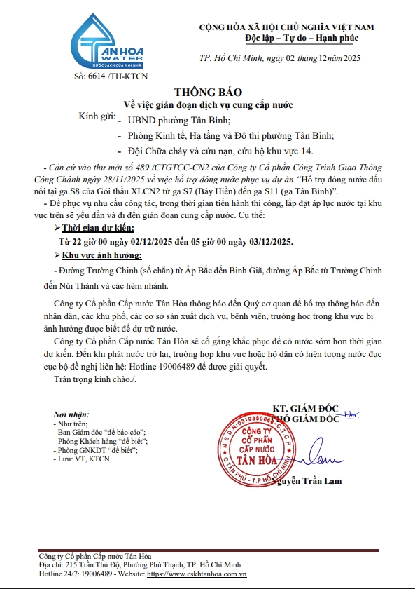 Căn cứ Thông báo số 6593,6594,6614,6620.6636/TH-KTCN ngày 01,2.3/12/2025 về việc gián đoạn DV cấp nước để phục vụ công tác“Di dời, Xử lý giao cắt , đấu nối tại ga S8 trên địa bàn Công ty quản lý”. Trong thời gian thi công, sửa chữa áp lực nước sẽ yếu dần và đi đến cúp nước.