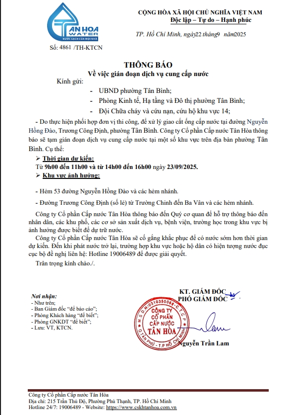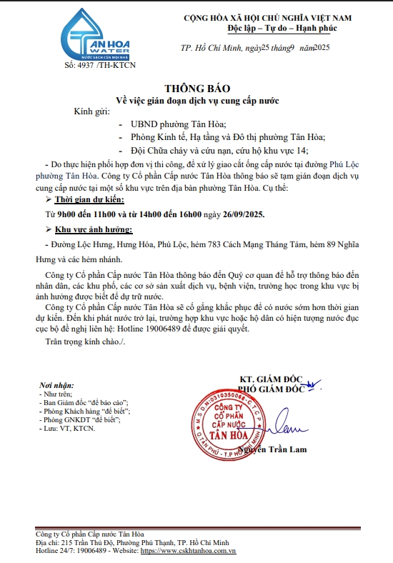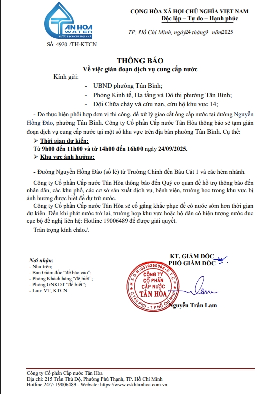 Căn cứ Thông báo số 4861,4920,4937/TH-KTCN ngày 22,24,25/9/2025 về việc gián đoạn DV cấp nước để phục vụ công tác“Xử lý giao cắt trên địa bàn Công ty quản lý”. Trong thời gian thi công, sửa chữa áp lực nước sẽ yếu dần và đi đến cúp nước.