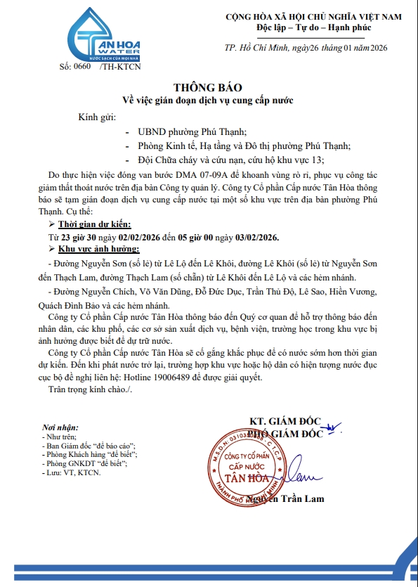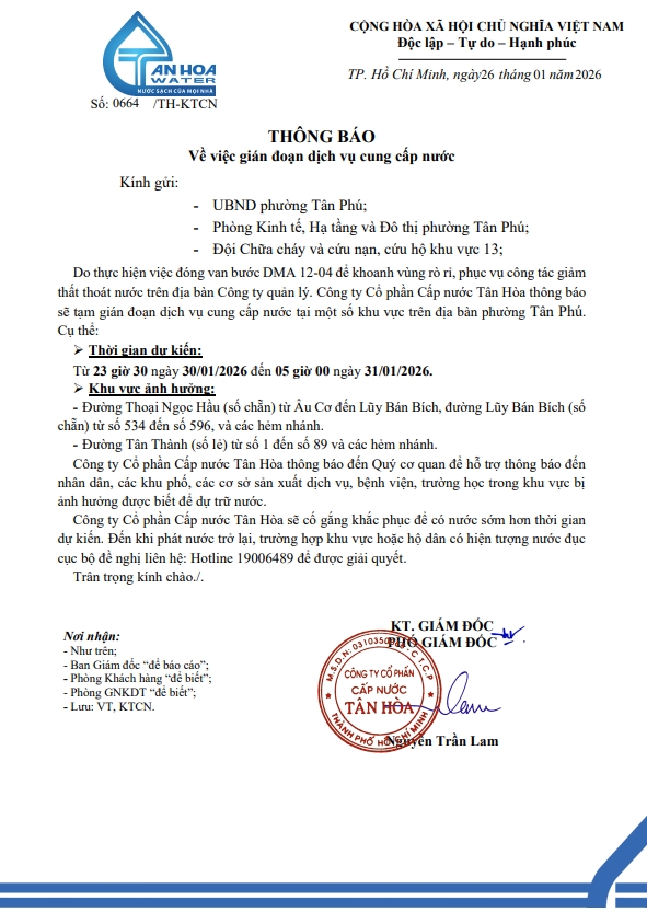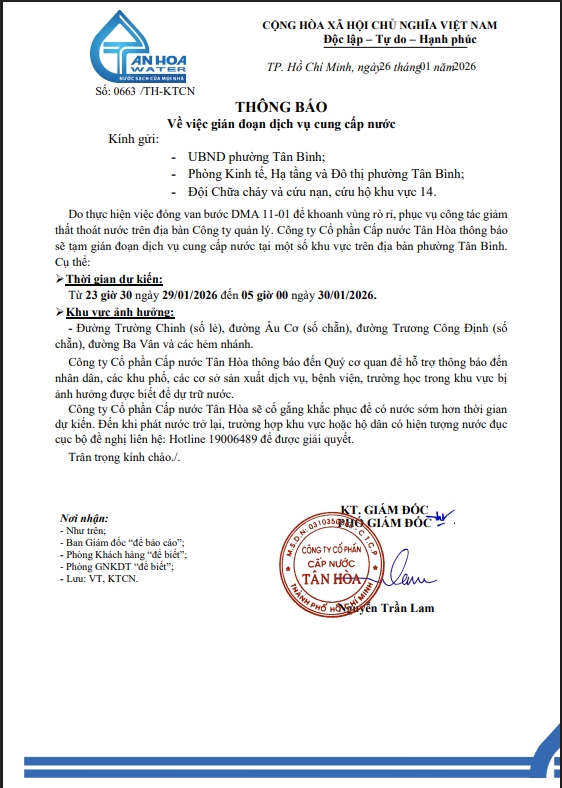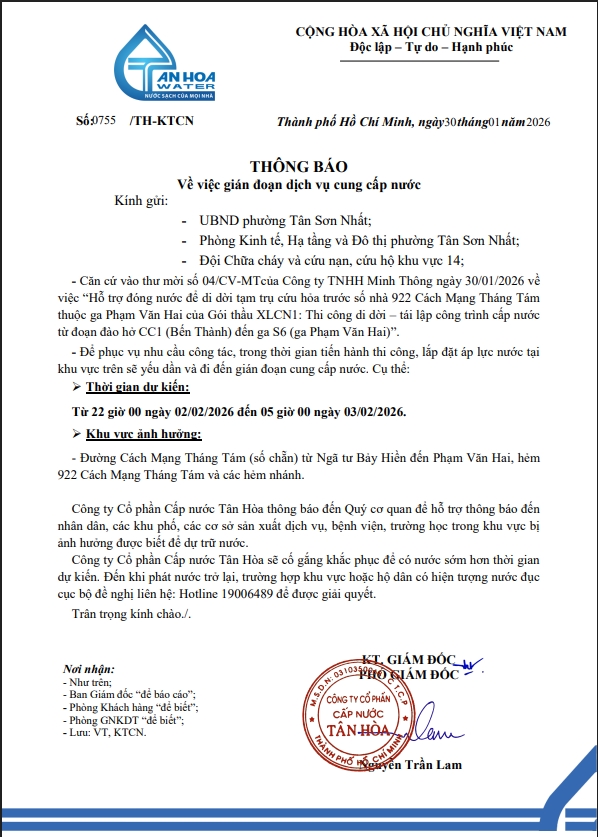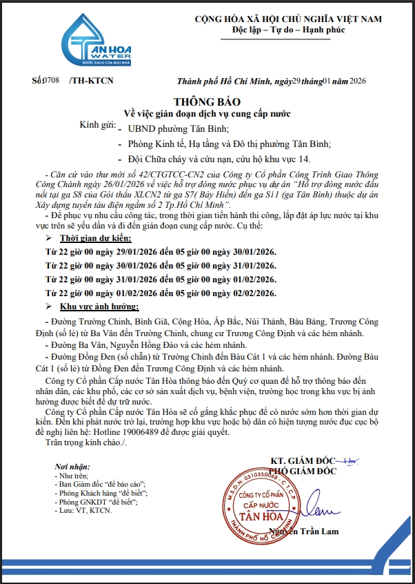 Căn cứ Thông báo số 0660,0662,0663,0664,0691,708,755/TH-KTCN ngày 16,28,29/01/2026 về việc gián đoạn DV cấp nước để phục vụ công tác“Khoanh vùng, rò rỉ, đấu nối thi công nhà ga S7; di dời trụ Cứu hỏa ”. Trong thời gian thi công, sửa chữa áp lực nước sẽ yếu dần và đi đến cúp nước.