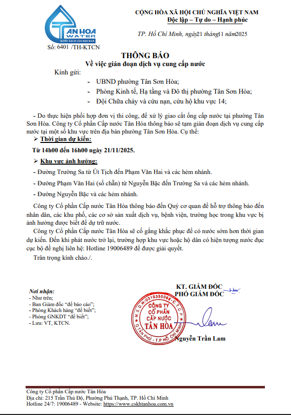 Căn cứ Thông báo số 6401/TH-KTCN ngày 21/11/2025 về việc gián đoạn DV cấp nước để phục vụ công tác“Xử lý giao cắt trên địa bàn Công ty quản lý”. Trong thời gian thi công, sửa chữa áp lực nước sẽ yếu dần và đi đến cúp nước.