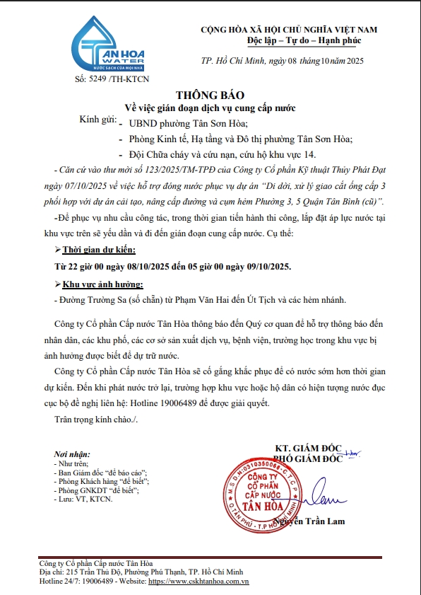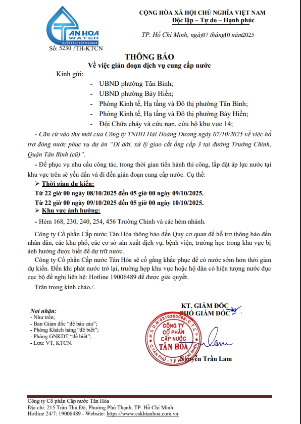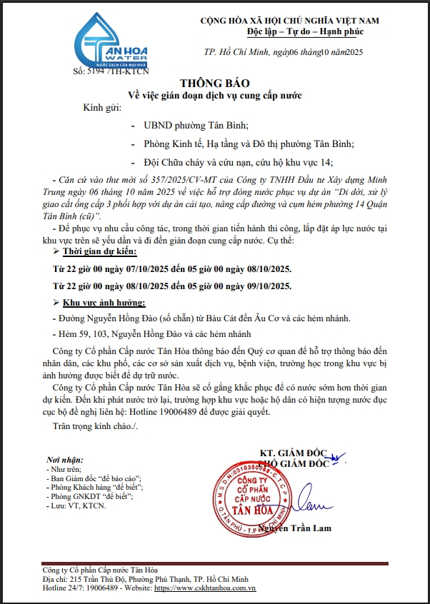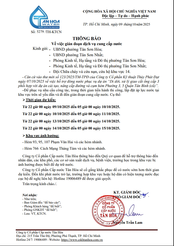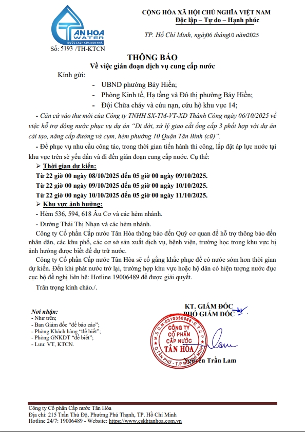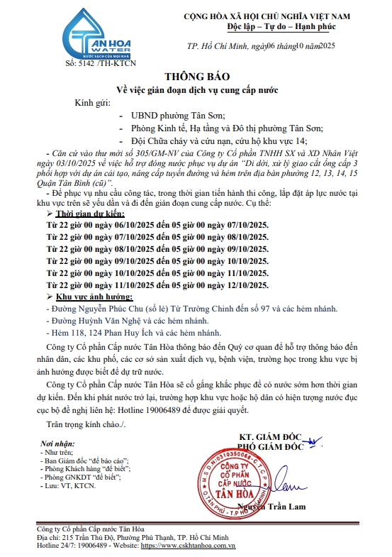 Căn cứ Thông báo số 5142,5193,5194,5230,5249,5279/TH-KTCN ngày 06,7,9/10/25 về việc gián đoạn DV cấp nước để phục vụ công tác“ Di dời, XLGC”. Trong thời gian thi công, sửa chữa áp lực nước sẽ yếu dần và đi đến cúp nước.