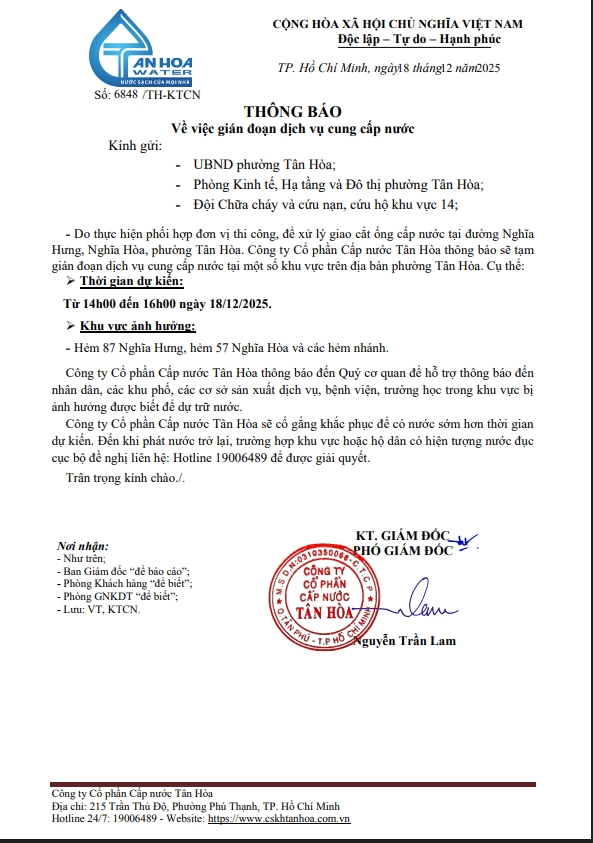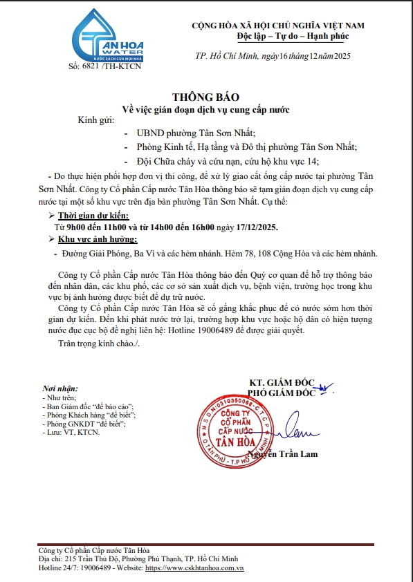 Căn cứ Thông báo số 6821,6848TH-KTCN ngày 16,17,18/12/2025 về việc gián đoạn DV cấp nước để phục vụ công tác“Xử lý giao cắt trên địa bàn Công ty quản lý”. Trong thời gian thi công, sửa chữa áp lực nước sẽ yếu dần và đi đến cúp nước.