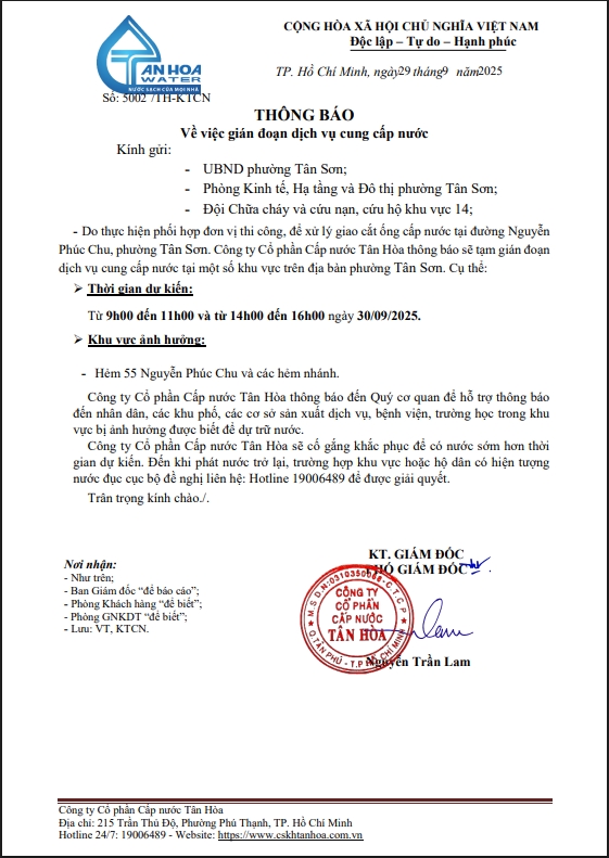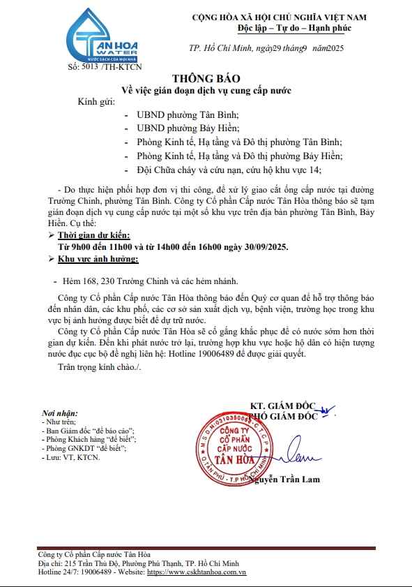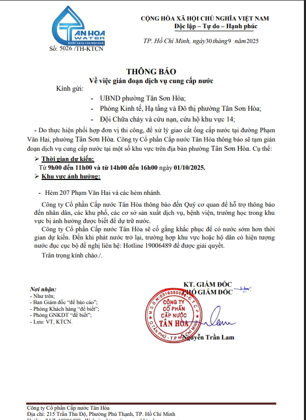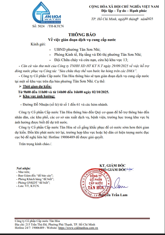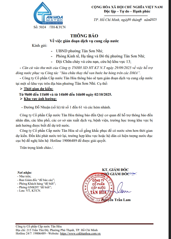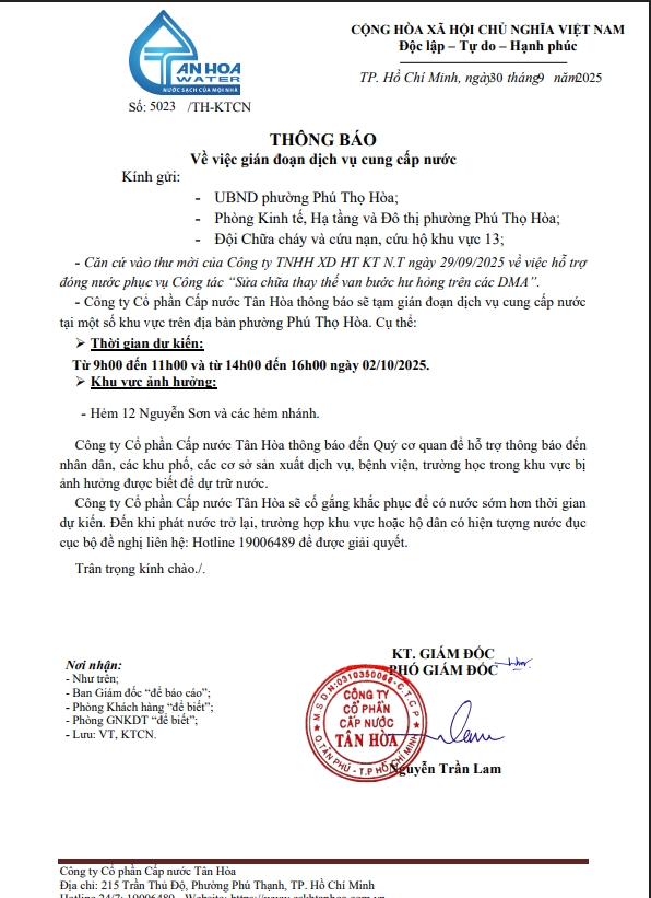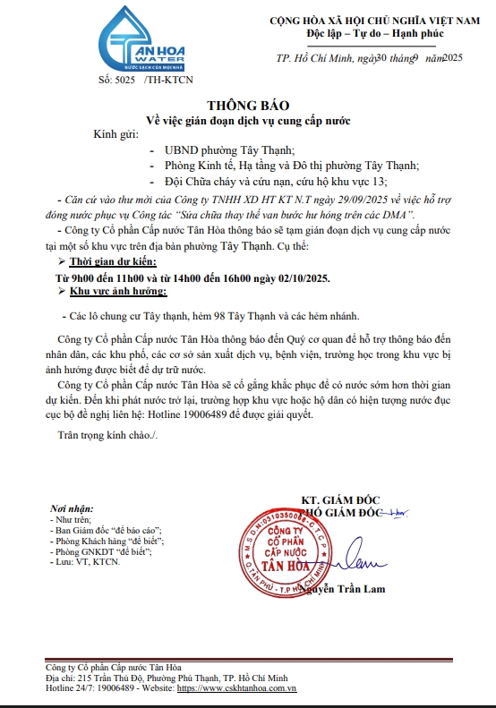 Căn cứ Thông báo số 5002,5013,23,24,25,26/TH-KTCN ngày 29,30/9/2025 về việc gián đoạn DV cấp nước để phục vụ công tác“Sửa chữa thay van;Xử lý giao cắt trên địa bàn Công ty quản lý”. Trong thời gian thi công, sửa chữa áp lực nước sẽ yếu dần và đi đến cúp nước.