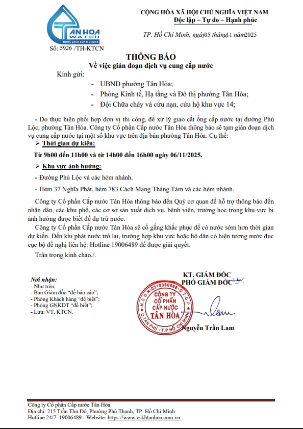 Căn cứ Thông báo số 5856,57,5900,5926/TH-KTCN ngày 03,5/11/2025 về việc gián đoạn DV cấp nước để phục vụ công tác“Xử lý giao cắt trên địa bàn Công ty quản lý”. Trong thời gian thi công, sửa chữa áp lực nước sẽ yếu dần và đi đến cúp nước.