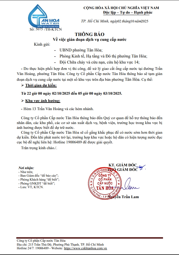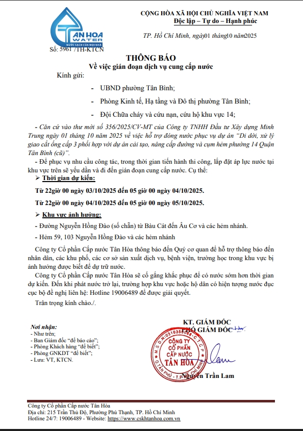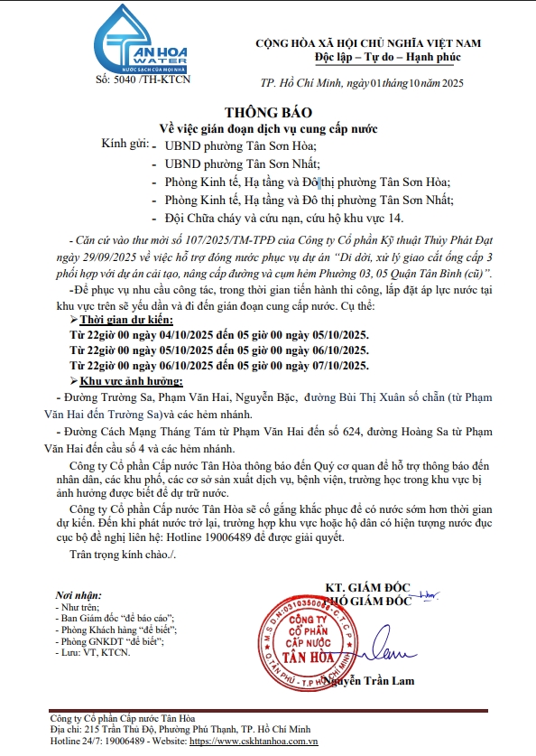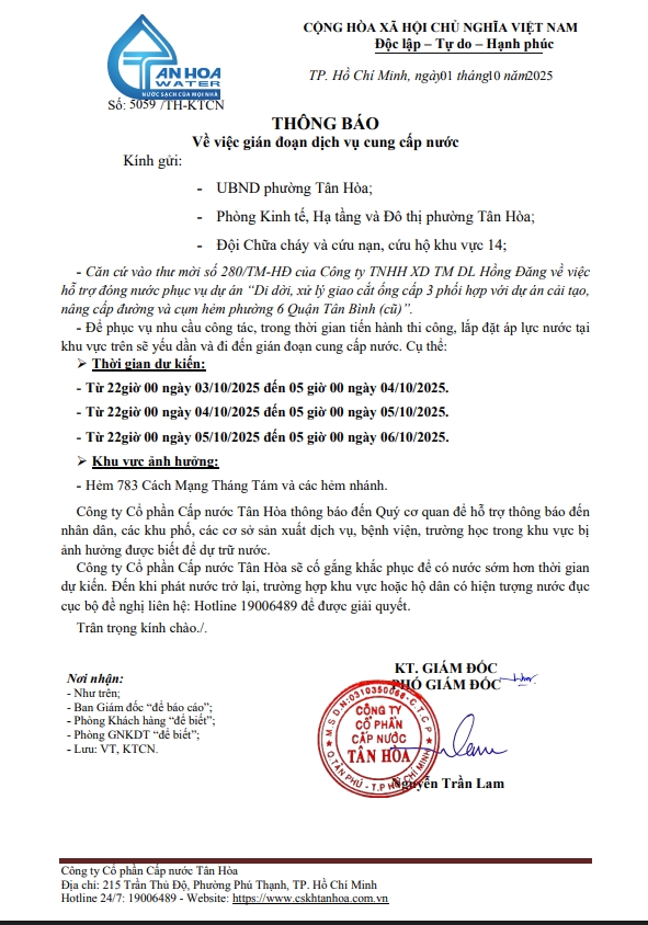 Căn cứ Thông báo số 5040,5059,5061,5075/TH-KTCN ngày 1,2/10/25 về việc gián đoạn DV cấp nước để phục vụ công tác“Di dời,,XLGC”. Trong thời gian thi công, sửa chữa áp lực nước sẽ yếu dần và đi đến cúp nước.