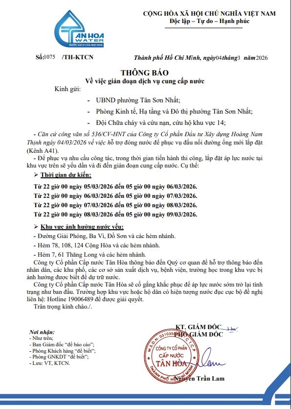 Căn cứ Thông báo số 1075/TH-KTCN ngày 04/03/2026 về việc gián đoạn DV cấp nước để phục vụ công tác“hỗ trợ đóng nước phục vụ công tác đấu nối ”. Trong thời gian thi công, sửa chữa áp lực nước sẽ yếu dần và đi đến cúp nước.