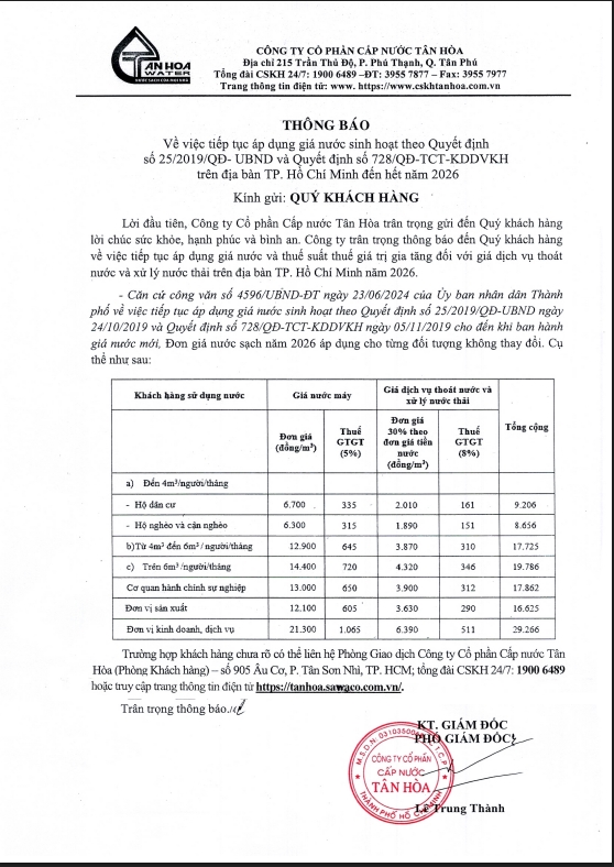Công ty Cổ phần Cấp Nước Tân Hòa thông báo tiếp tục áp dụng giá nước trên địa bàn Tp. Hồ Chí Minh năm 2026